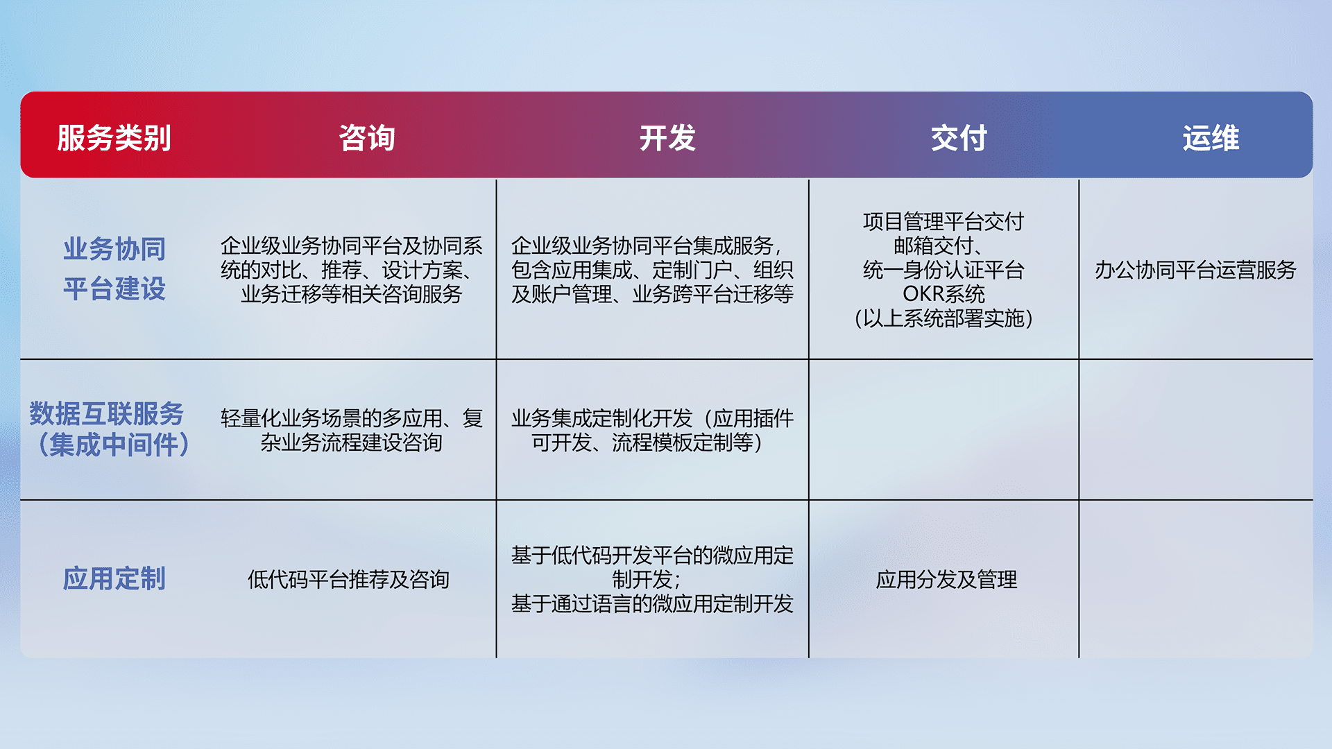 针对钉钉、、、、企微、、、IDaas等平台级产品提供产品的规划、、、、方案、、、、交付、、、定制化开发等服务,,实现如统一协同办公、、、、智能客户服务、、混合会议管理、、智能数据查询、、等业务场景,,,,实现数字化转型。。。。
